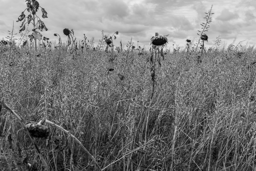 De uitgebloeide Zonnebloemen.